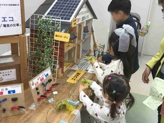 私たちのブースでは「さがぼーくんフォトスポット」、缶バッジ作り体験、ペロブスカイト太陽電池の紹介展示、地球温暖化の展示と自分にできることにシール貼り、会員の協力により電気の仕事体験(手回し発電)、ソーラーカー・バッタを動かそう、森の木の実や枝でお人形づくりを実施しました。